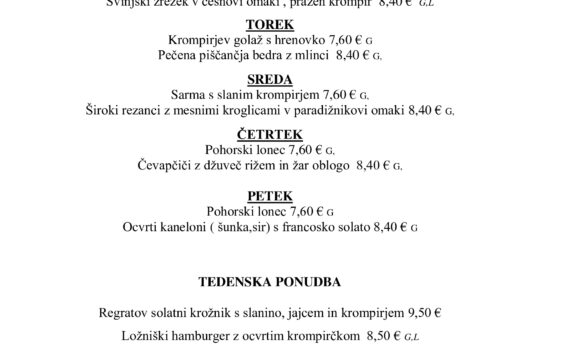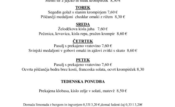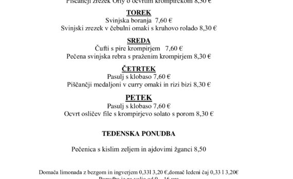 Ponedeljek – petek 9.00 – 22.00Sobota 11.00 – 22.00Nedelja in prazniki ZAPRTO KOLEKTIVNI DOPUST 23.7.2023 – 6.8.2023 V času kolektivnega dopusta so sobe na voljo le z zajtrkom.