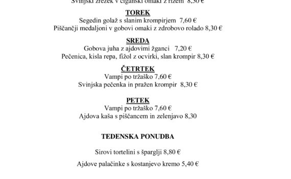 Ponedeljek – petek 9.00 – 22.00Sobota 11.00 – 22.00Nedelja in prazniki ZAPRTO KOLEKTIVNI DOPUST 23.7.2023 – 6.8.2023 V času kolektivnega dopusta so sobe na voljo le z zajtrkom.