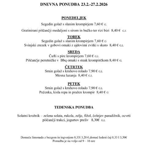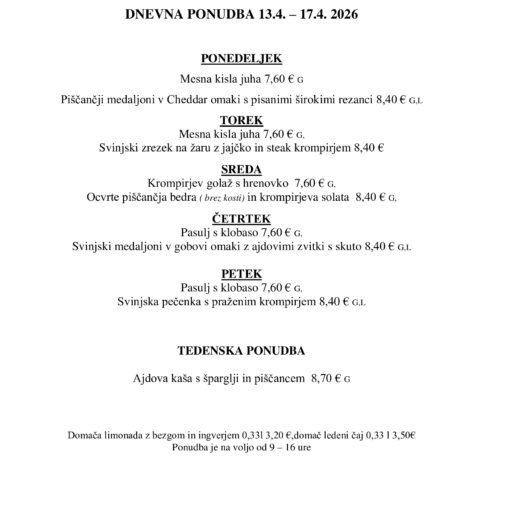 Ponedeljek – petek 9.00 – 22.00Sobota 11.00 – 22.00Nedelja in prazniki ZAPRTO KOLEKTIVNI DOPUST 23.7.2023 – 6.8.2023 V času kolektivnega dopusta so […]